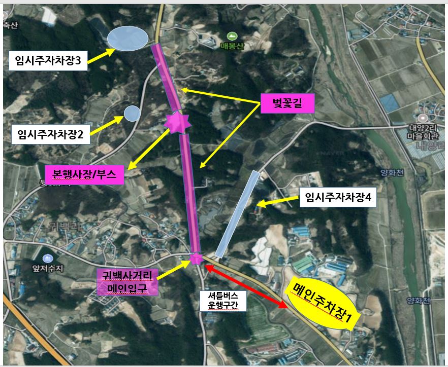 - 임시주차장 4 : 도로 한쪽 차선을 막고 임시주차장으로 사용하는 곳으로 본행사장까지 가는 길이 비포장 농로를 가로질러 갈 수 있습니다.