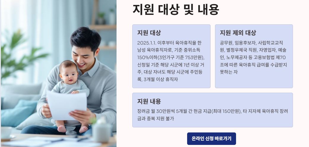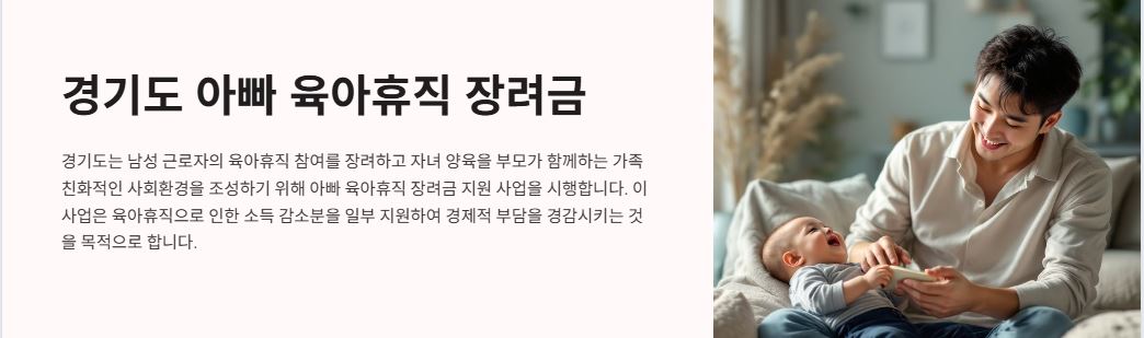육아휴직을 고민하고 계신 아빠라면 주목하세요! 경기도에서는 아빠들의 적극적인 육아 참여를 장려하기 위해 ‘아빠 육아휴직 장려금’을 지원하고 있습니다. 신청 방법부터 지원 혜택까지 자세하게 안내해 드릴 테니 끝까지 읽어보시고, 지금 바로 신청해보세요!