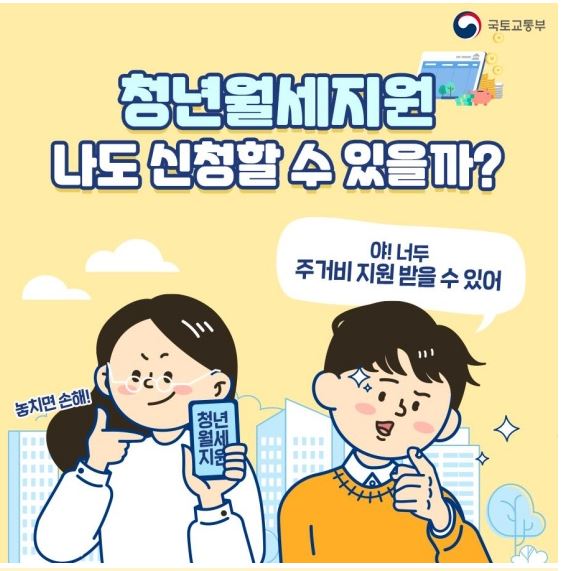 국토교통부(청년주거정책과)에서는 고금리. 고물가 등으로 경제적 어려움을 겪는 청년층의 주거비 부담 경감을 위해 청년월세를 한시적으로 지원합니다.